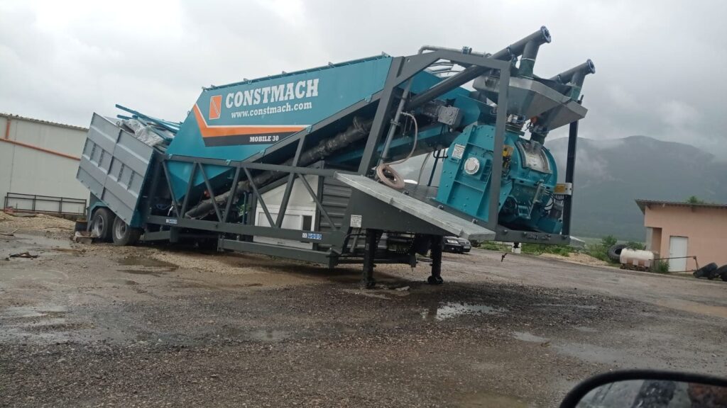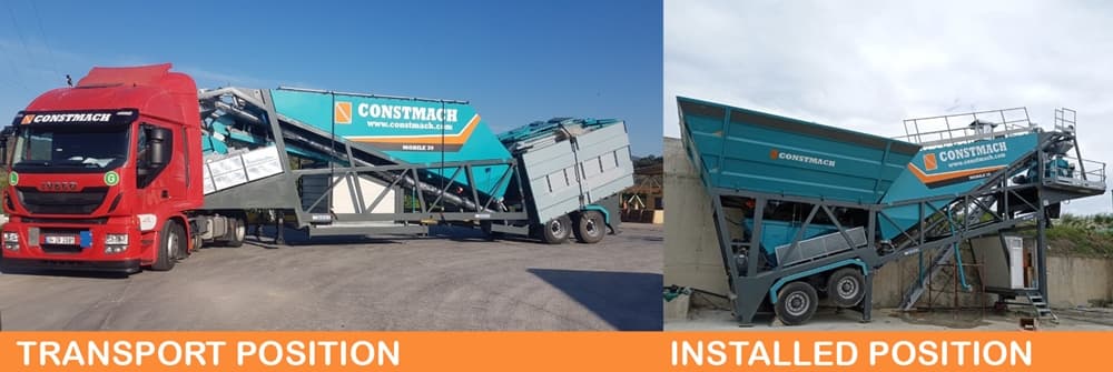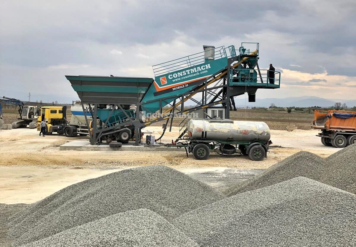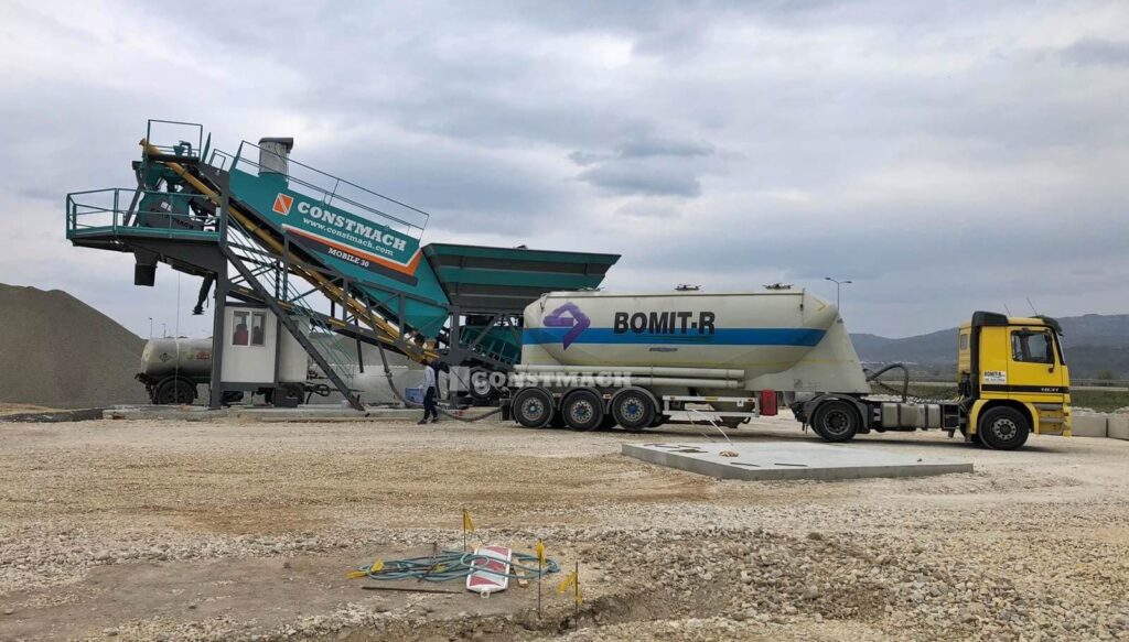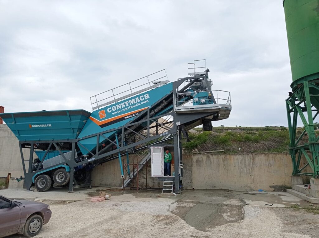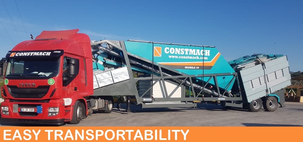 CONSTMACH MOBILE 30 full automatic mobile concrete batching plant is a suitable solution for temporary needs with its features of rapid installation, advantage of starting production in a short time and minimum infrastructure necessity. MOBILE 30 mobile concrete plant has the features of being able to have all necessary equipments for concrete production, even a cement silo is located on a single wheeled mobile chassis and this offers easy transportation and rapid installation advantages to its users.